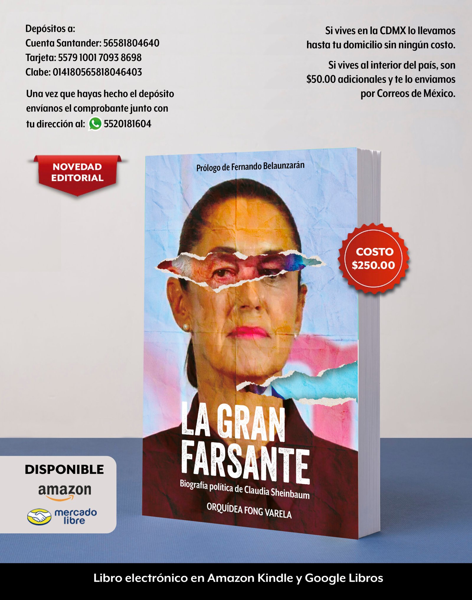 Claudia Sheinbaum es corrupta, represora y mentirosa. Debe muchas vidas, ha cometido muchos delitos, saqueó las finanzas de la CDMX, ocultó miles de muertos de la pandemia, dejó a familias pobres en la calle, engañó a damnificados del sismo y traicionó a víctimas de feminicidio. Es una leal sirviente de Andrés Manuel López Obrador, que quiere sentarla en la silla presidencial para seguir gobernando a larga distancia. A lo largo de estas páginas el lector descubrirá una Claudia Sheinbaum muy distinta a la que la propaganda esparcida por los periodistas a sueldo han retratado. Este libro quita los velos y exhibe bajo una potente luz a la Claudia que, por obra de la mentira y la manipulación se ha mantenido oculta: a la gran farsante.