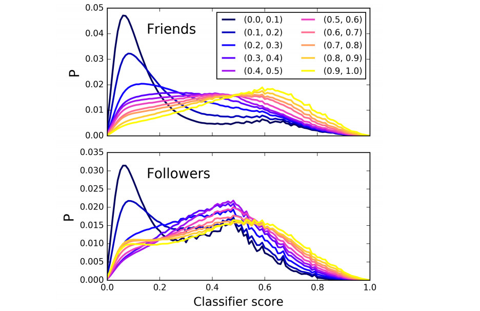 La línea más oscura señala los valores 0.0 y 0.1, que son las cuentas 100% humanas. El pico más alto en ambos gráficos está en la posición entre el 0.0 y el 0.2, lo que significa que quienes les siguen son principalmente humanos, mientras en el gráfico "Followers", la línea más oscura de los humanos tiene un segundo pico en la zona de 0.5, es decir, que los bots más "sofisticados" también suelen seguir a los humanos.