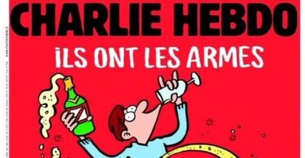En la portada de la revista, que comenzará a circular este miércoles, los editores señalan que “Ellos tienen armas. A la mierda. ¡Nosotros tenemos champán!” acompañado de la viñeta con un personaje en la fiesta, y a quien le sale el preciado líquido a través de los hoyos que dejan las balas.