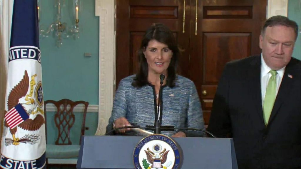 En un mensaje a medios de comunicación y sin aceptar preguntas de la prensa, Nikki Haley, embajadora ante la ONU cuestionó que en el Consejo haya representatividad de países como Venezuela China, Cuba o la República Democrática del Congo, en donde se violan constantemente los derechos humanos. Asimismo, lo acusó de asumir una actitud “sesgada” respecto al gobierno de Israel.