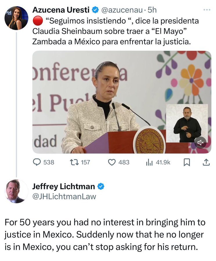 Bajo un tuit de la periodista Azucena Uresti donde se informa que Sheinbaum insistió en pedir información a EE.UU sobre la captura de Zambada, Litchman escribió: