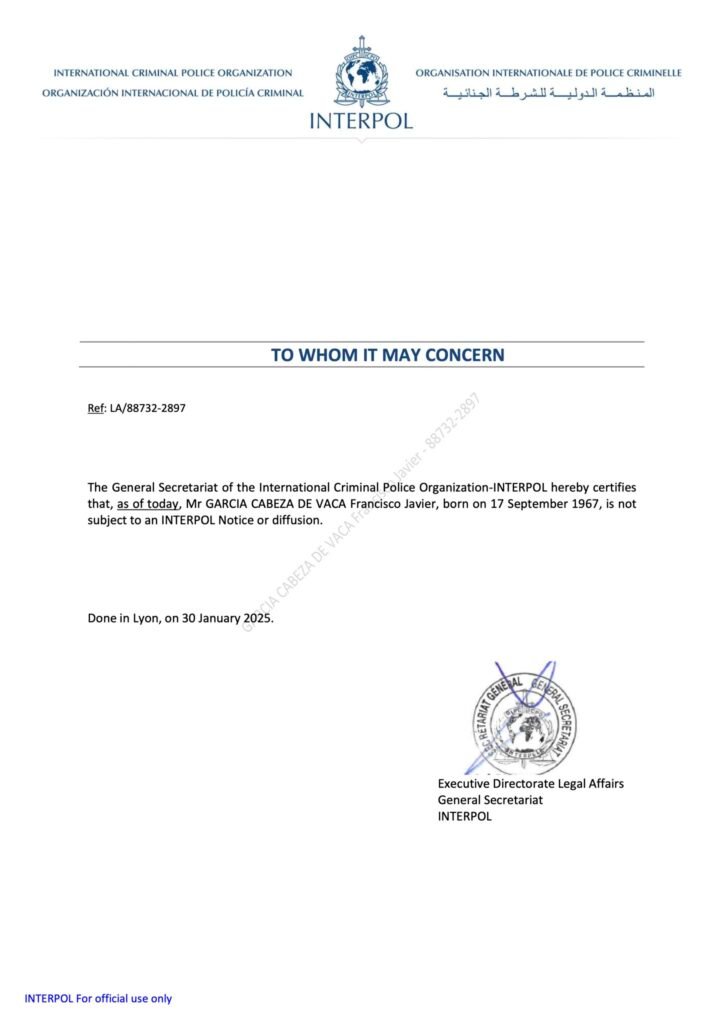 El mensaje dice textualmente que el secretario general de la Organización Internacional de Policía Criminal “certifica aquí que, A PARTIR DE HOY, el señor Francisco Javier García Cabeza de Vaca, nacido el 17 de septiembre de 1967, no es sujeto de ningún aviso o ficha”.