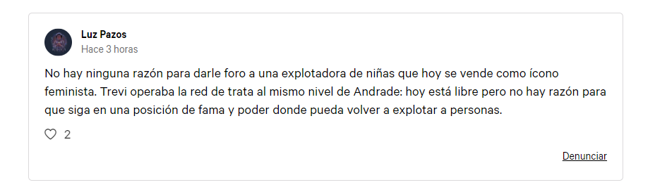“Es hora de que esa señora pague y dejé de colgarse del feminismo o la comunidad LGBT para “borrar” su historial”. Otro usuario señaló: “No hay ninguna razón para darle foro a una explotadora de niñas que hoy se vende como ícono feminista. Trevi operaba la red de trata al mismo nivel de Andrade: hoy está libre pero no hay razón para que siga en una posición de fama y poder donde pueda volver a explotar a personas”.