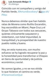 “Nunca debemos olvidar que han habido ratas de Morena como Rutilio Escandón, hoy escondido en Miami, Pepe Cruz y el Grupo Tabasco con todos sus secuaces, quienes cínicamente saquearon y violentaron, con total impunidad, la tranquilidad y la prosperidad de nuestro pueblo noble y bueno”, posteó el legislador.