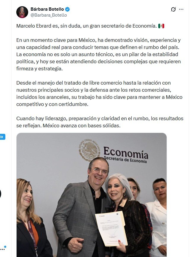 “Marcelo Ebrard es, sin duda, un gran secretario de Economía. En un momento clave para México, ha demostrado visión, experiencia y una capacidad real para conducir temas que definen el rumbo del país… Cuando hay liderazgo, preparación y claridad en el rumbo, los resultados se reflejan. México avanza con bases sólidas”.