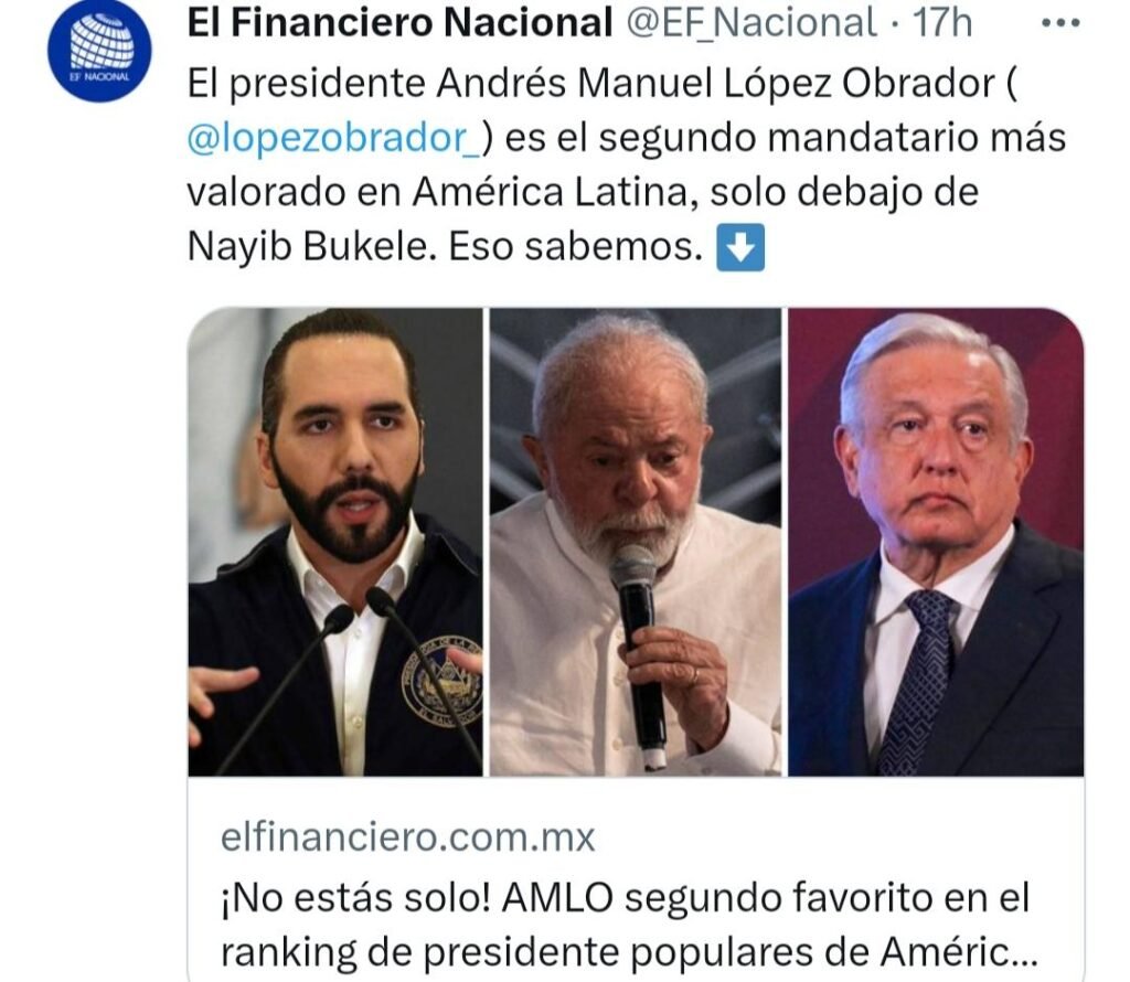 Unas cuatro horas más tarde la misma cuenta publicó un mensaje con unos de los temas predilectos del gobierno y del oficialismo: “El presidente Andrés Manuel López Obrador (@lopezobrador_) es el segundo mandatario más valorado en América Latina, solo debajo de Nayib Bukele. Eso sabemos”.