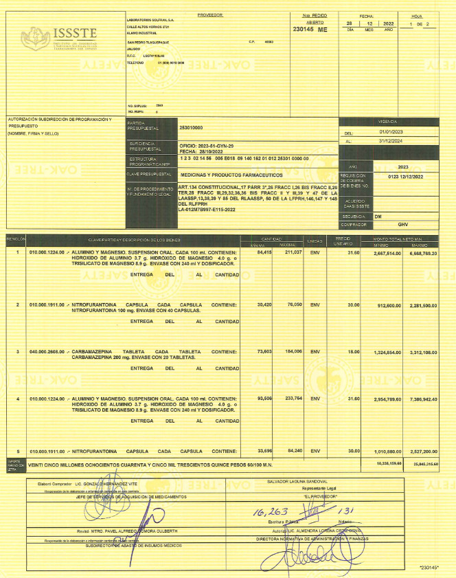 El contrato 23041-ME que firmó en 2023 el ISSSTE con Laboratorios Solfran establece que la empresa le vendió al gobierno los medicamentos de Aluminio y Magnesio en suspensión oral, Nitrofurantoina en Cápsula y Carbamazepina en tableta por un monto total de 25 millones 845 mil pesos.