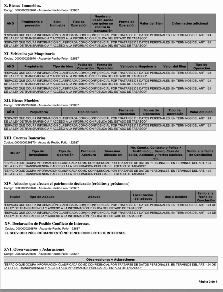 En el documento de hace cuatro años, que acaba de ser liberado en el portal de Transparencia de la Secretaría de Anticorrupción del gobierno estatal, “Pepín” clasifica como “confidencial” toda la información concerniente a las dos propiedades que reconoce “por tratarse de datos personales en términos del artículo 124 de la Ley de Transparencia y Acceso a la Información”.