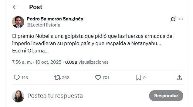 Por su parte el historiador Pedro Salmerón llamó “golpista” a la Premio Nobel: “El premio Nobel a una golpista que pidió que las fuerzas armadas del imperio invadieran su propio país y que respalda a Netanyahu… Eso ni Obama”.