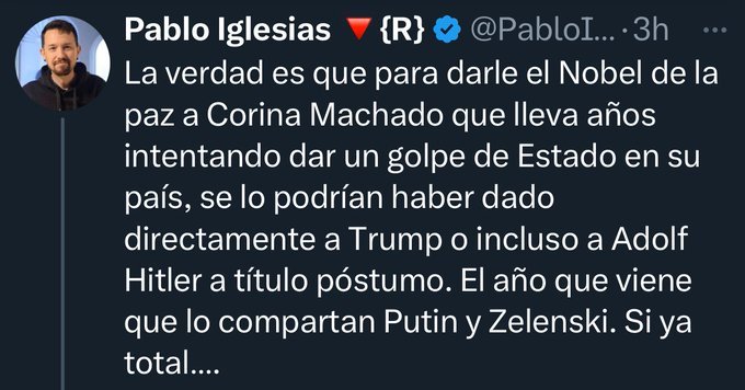 “La verdad es que para darle el Nobel de la Paz a Corina Machado que lleva años intentado dar un golpe de Estado en su país, se lo podrían haber dado directamente a Trump o incluso a Adolf Hitler a título póstumo”.