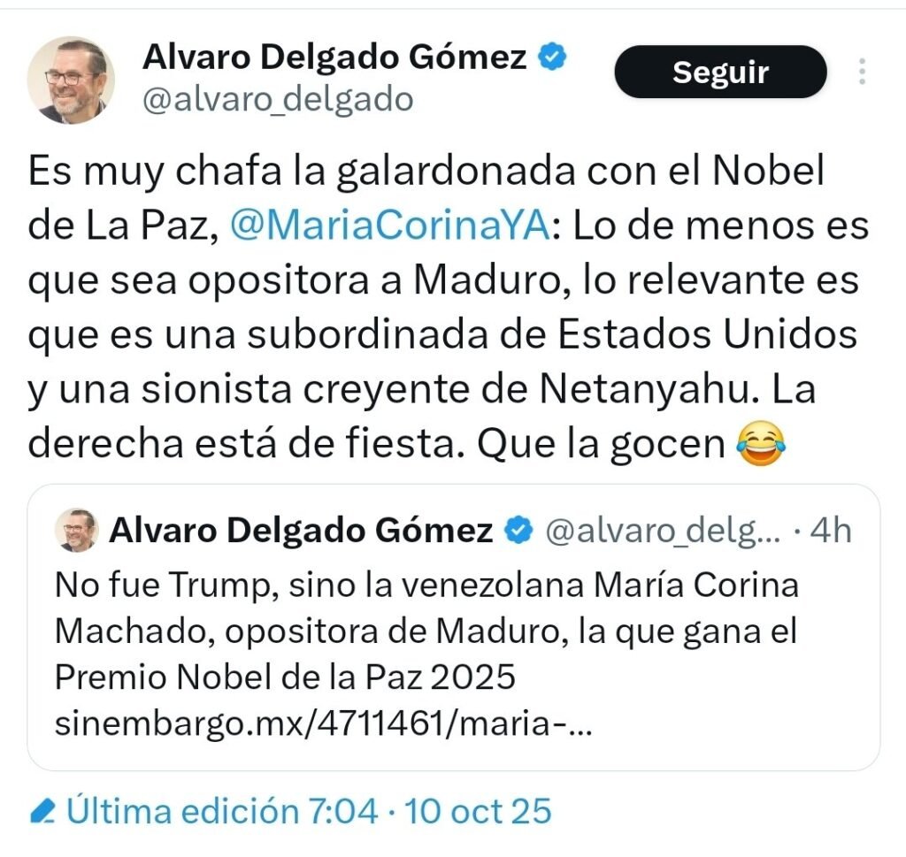 A su vez, Álvaro Delgado dijo que “los golpistas”, miembros de “la derechota”, se encuentran felices con el Nobel de la Paz a María Corina. Esto, al compartir un tuit del expresidente Felipe Calderón celebrando el premio. “Los golpistas se juntan”, dijo.