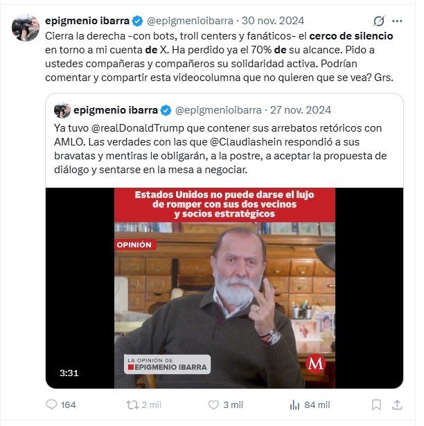 El 30 de noviembre de ese año se quejó así: “Cierra la derecha -con bots, troll centers y fanáticos– el cerco de silencio en torno a mi cuenta de X. Ha perdido ya el 70% de su alcance. Pido a ustedes compañeras y compañeros su solidaridad activa”, para compartir “esta videocolumna que no quieren que se vea”.