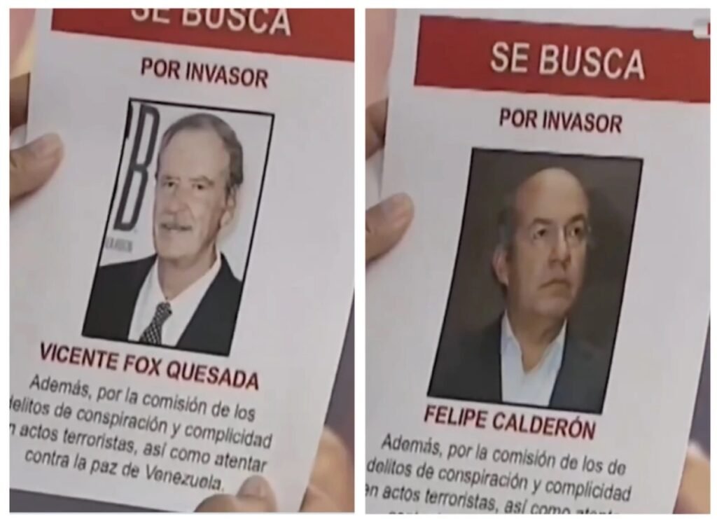 Ya este jueves se dieron a conocer los carteles que muestran, entre otros, los rostros de Vicente Fox y Felipe Calderón con la leyenda “Se busca por invasor. Además, por la comisión de los delitos de conspiración y complicidad en actos terroristas, así como atentar contra la paz de Venezuela”.
