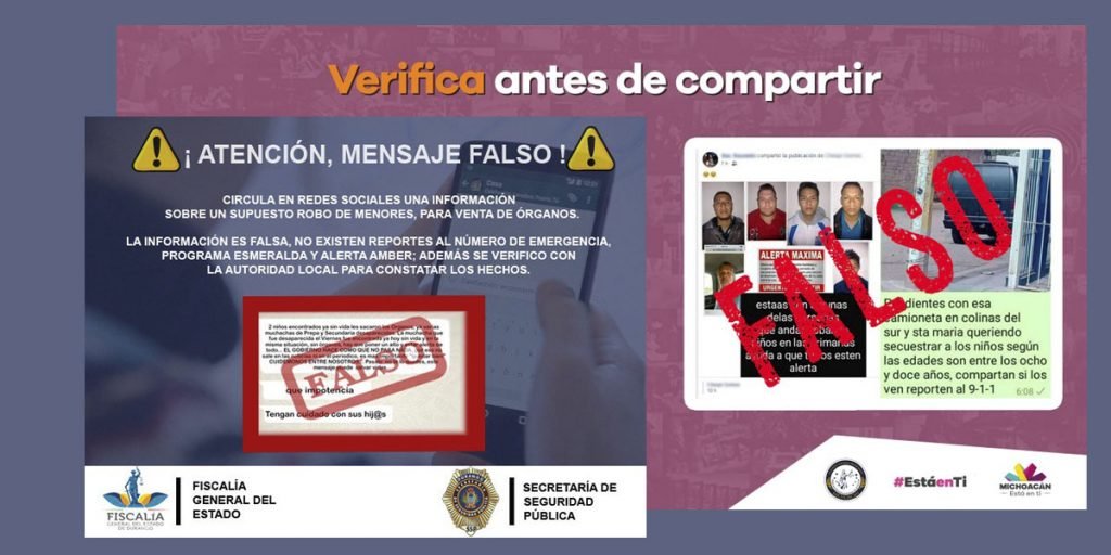 En tanto la de Tabasco informa: “Fiscalía General del Estado (FGE) de Tabasco informa que hasta el momento la institución no ha recibido denuncias por casos de robo de niños a como ha circulado recientemente en la entidad a través de mensajes de WhatsApp y redes sociales. Por lo anterior, se exhorta a la ciudadanía a no creer ni compartir mensajes falsos sobre la supuesta sustracción de menores para evitar crear un clima de incertidumbre en la población ”.