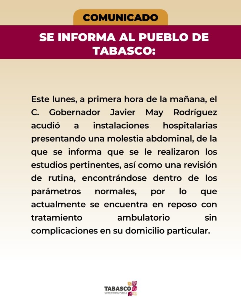 El gobernador de Tabasco, Javier May, confirmó en sus redes sociales que esta mañana fue atendido de urgencia por especialistas a causa “de una molestia abdominal”, lo que hizo que tuviera que cancelar indefinidamente sus actividades públicas.