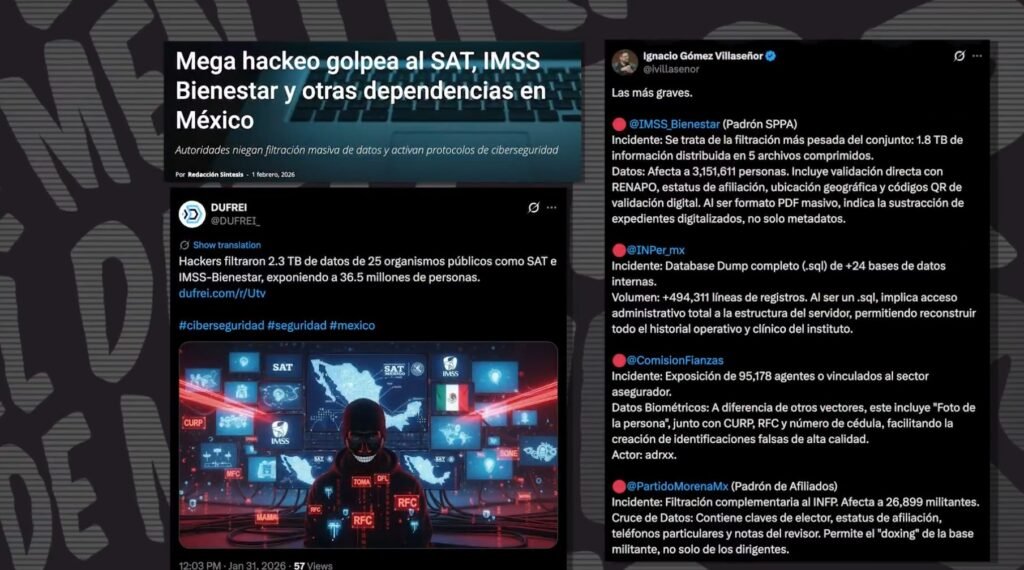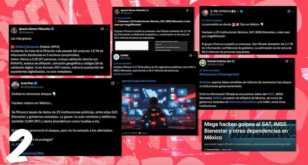 Un ejemplo tuvo lugar el 4 de febrero, en que Infodemia publicó que el Detector de Mentiras desmintió “un supuesto hackeo al IMSS Bienestar” y filtraciones de bases de datos de derechohabientes, mostrando en pantalla varios tuits de Gómez Villaseñor y otras personas.