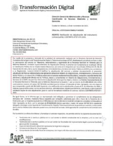 Así consta en el oficio de notificación dirigido a la encuestadora fechado el 28 de noviembre de 2025, disponible en la plataforma Compras MX, firmado por Daniel Chavarría Teissier, coordinador de Recursos Materiales y Servicios Generales de la Dirección de Administración y Finanzas de la ATDT; en el documento también se indica que la firma del contrato respectivo tendrá lugar dentro de los 15 días hábiles posteriores a la fecha de notificación