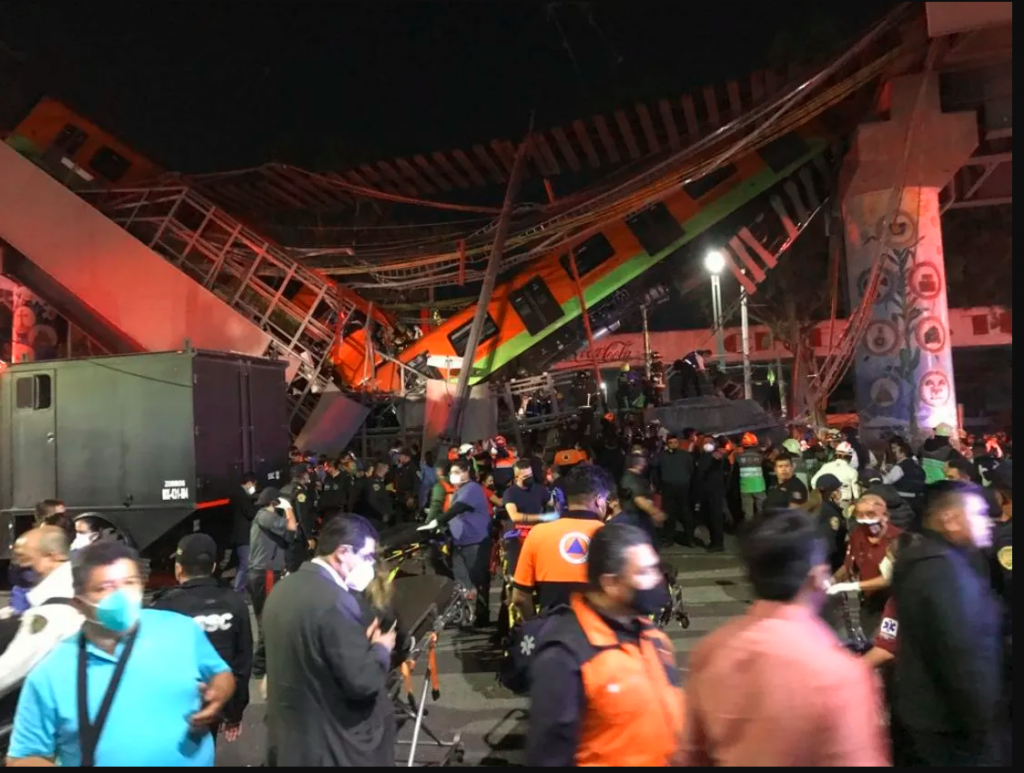 Un tramo de la vía elevada de la Línea 12, llamada en su momento la “línea dorada” o la “línea del bicentenario”, colapsó mientras un tren circulaba por encima, con terribles consecuencias: el tren quedó doblado, los pasajeros atrapados a oscuras, algunos de ellos prensados por la posición de los vagones y, bajo las enormes piezas de concreto, autos sepultados.