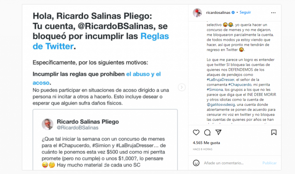 La plataforma Twitter determinó bloquear parcialmente la cuenta del empresario Ricardo Salinas Pliego, luego de que llamó a organizar un “concurso de memes” para hacer sorna de diversos personajes, entre los que se encuentra Denisse Dresser, a quien llamó “La Bruja”.