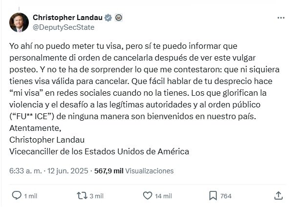 La publicación provocó una respuesta directa de Landau, quien primero señaló que, ante ese tipo de actitudes, ordenó personalmente la cancelación de la visa de Cornejo. Poco después, añadió un segundo mensaje más revelador: “Ni siquiera tienes una visa válida para cancelar, así que deja de fingir lo contrario.”