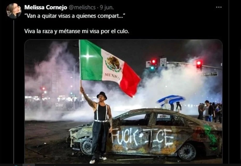 En su cuenta de X (antes Twitter), Cornejo publicó la fotografía de una camioneta con la leyenda “Fuck ICE” y un manifestante encapuchado ondeando la bandera de México. Acompañó la imagen con la frase: