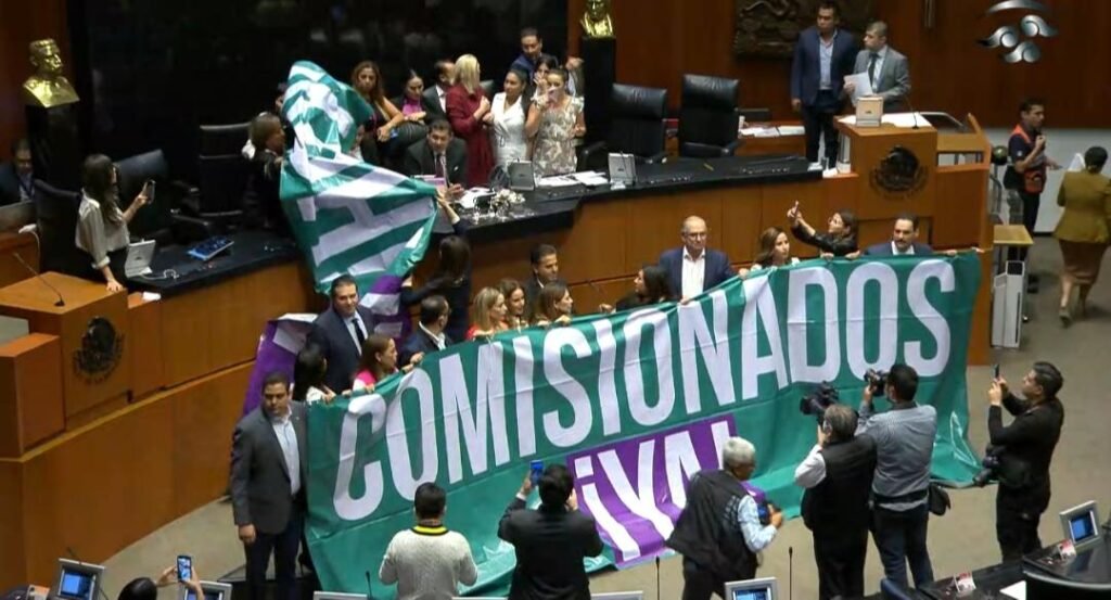 Así, las expectativas de nombrar al comisionado quedaron frustradas, por lo que la oposición tomó la tribuna al grito de “¡transparencia!”, y colocó grandes mantas en demanda de la designación. Mientras Monreal hacía llamadas desde su curul y pese a la intención de Alejandro Armenta, presidente de la Mesa Directiva del Senado, de continuar con los siguientes asuntos y tras varias mociones de orden, se impuso un receso por las protestas.