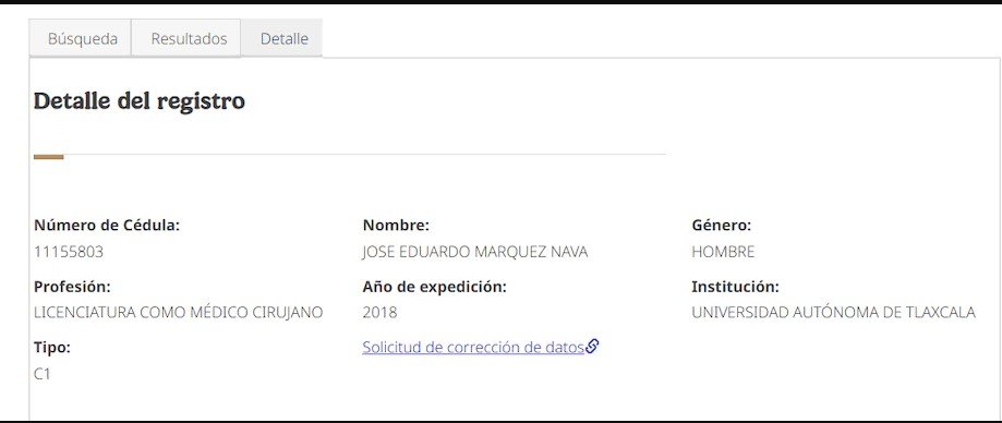 Su cédula profesional fue emitida en 2018 por la Universidad Autónoma de Tlaxcala y es la 11155803. También es laboratorista químico y tiene el cargo de médico de guardia de la Secretaría de Seguridad Pública.