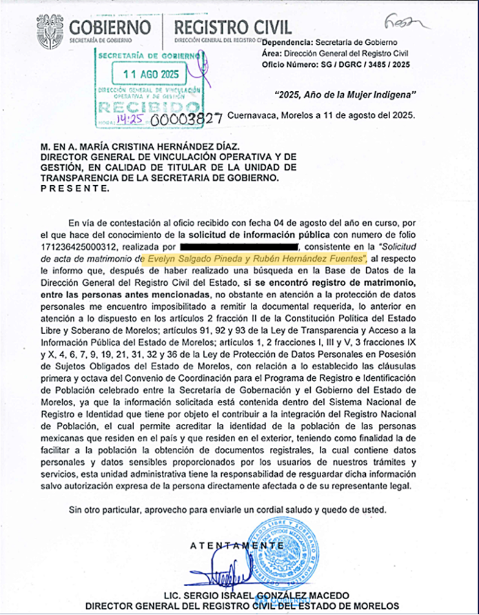 “Le informo que, después de haber realizado una búsqueda en la Base de Datos de la Dirección General del Registro Civil del Estado, sí se encontró registro de matrimonio entre las personas antes mencionadas”, es decir, Evelyn Salgado Pineda y Rubén Hernández Fuentes.