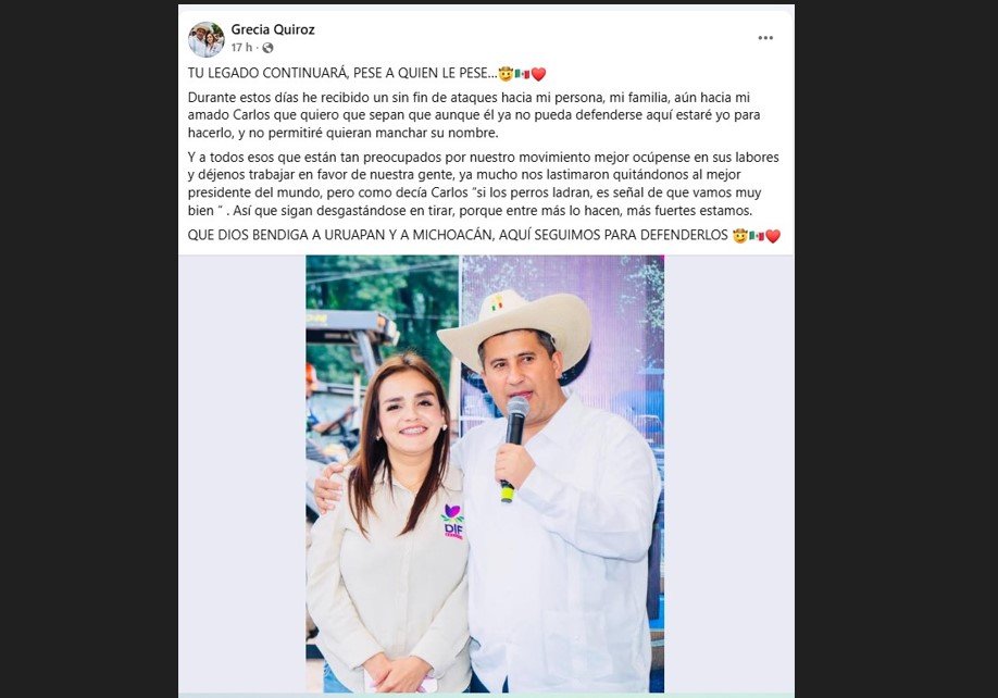 Tras los ataques de que ha sido objeto por parte de personajes políticos de la 4T, la alcaldesa de Uruapan, Grecia Quiroz, salió en defensa de la memoria de su esposo, Carlos Manzo y en la suya propia.