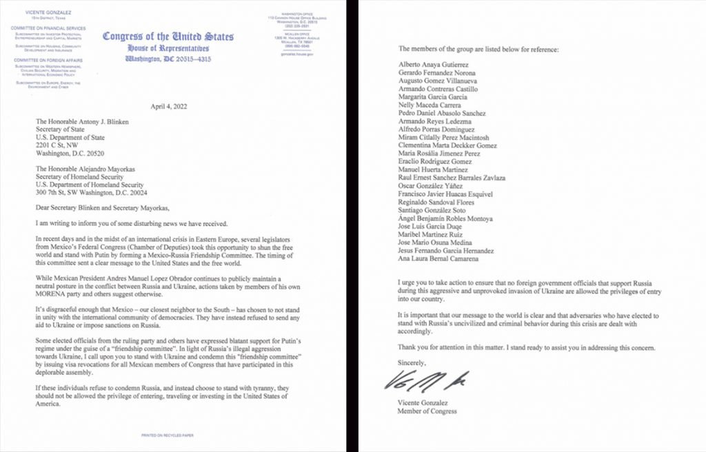 El congresista por Texas, Vicente González pidió al Secretario de Estado de los Estados Unidos, Anthony Blinken, así como al Secretario de Seguridad Nacional, Alejandro Mayorkas, retirar la visa a los miembros del Congreso mexicano que participan en el “Comité de Amistad México-Rusia” y de esta manera no se les permita ingresar, viajar o invertir en los Estados Unidos.