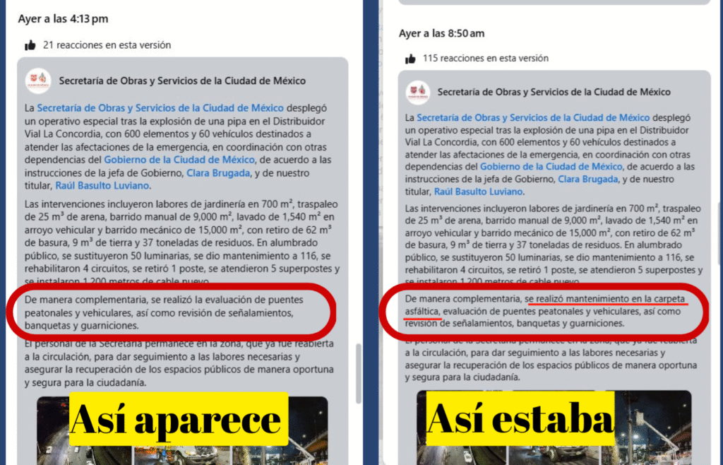 Horas después, cuando ya era incontenible el rumor en redes de que la causa del accidente habían sido los baches –por causa del testimonio arriba mencionado– la publicación de la dependencia se modificó y se eliminó la frase donde se habla de haber dado mantenimiento al asfalto.