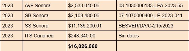 El gobierno de Alfonso Durazo inició en 2021 y desde entonces ha suscrito cuatro contratos con la empresa Total Parts And Components, todos en 2023. El total, modesto si se le compara con lo que le ha otorgado Brugada y lo que le dio Sheinbaum como jefa de gobierno es de “apenas” 16 millones 26 mil 60 pesos.