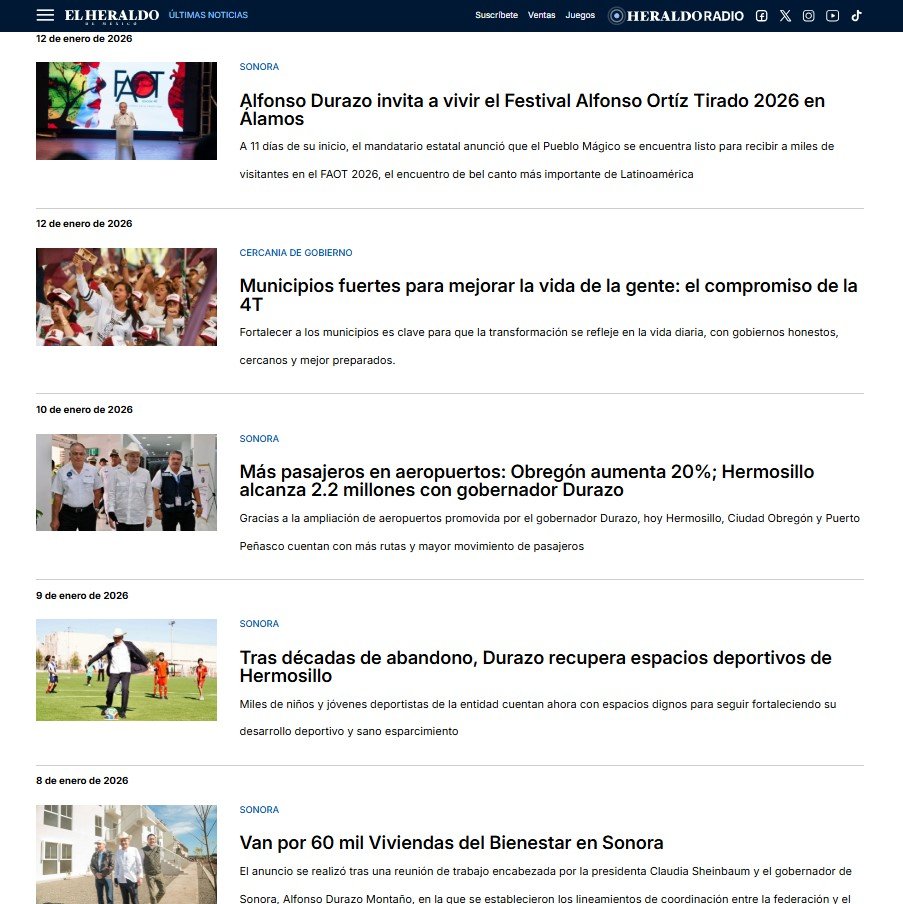 “Alfonso Durazo transforma la seguridad en vocación de servicio: USP suma mil 400 aspirantes”, del pasado 18 de enero. O esta del 9 de enero titulada “Tras décadas de abandono, Durazo recupera espacios deportivos de Hermosillo” y esta del 1 de noviembre, relativa al incendio de una tienda Waldo’s en Hermosillo: “Nadie enfrentará este dolor en soledad: Alfonso Durazo asegura apoyo a familias de fallecidos en incendio de Hermosillo”.