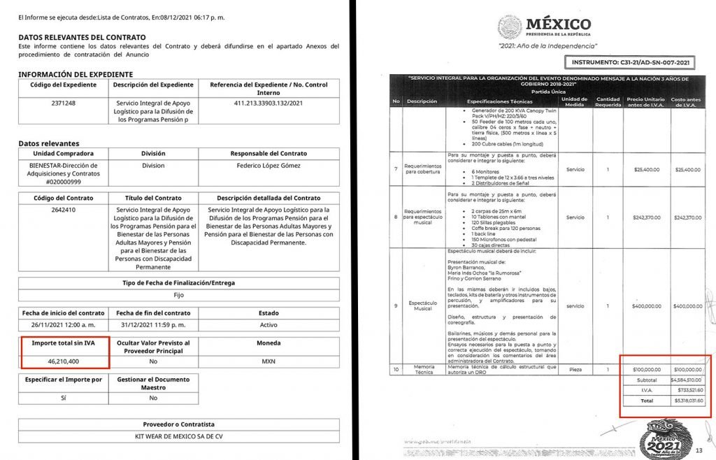 El mismo día que presuntamente prestó el servicio del AMLOFest, el 1 de diciembre de 2021, la misma compañía obtuvo por adjudicación directa otro contrato, el número 411.213.33903.132/2021, ese por 53 millones 604 mil pesos por la Secretaría de Bienestar, por “Apoyo Logístico para la Difusión de los Programas Pensión para el Bienestar de las Personas Adultas Mayores y Pensión para el Bienestar de las Personas con Discapacidad Permanente”.