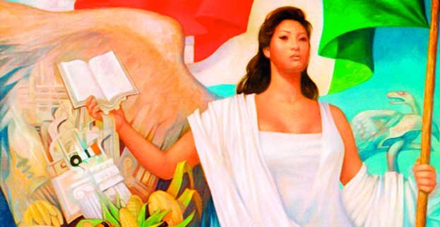 Pocas imágenes tienen tanto peso en México como “La Patria”, pintada por el artista jalisciense Jorge González Camarena, por encargo de la Comisión Nacional de Libros de Texto Gratuitos. Como evocación nostálgica de mejores días, como punto de partida para la crítica social, a veces de gran acidez, esa mujer fuerte, de claros rasgos mestizos que mira al infinito, es guardiana de la bandera tricolor. Arropada por las alas del águila mexicana, ella es todavía símbolo poderoso que representa, para muchos, lo más defendible de nuestro país. Es una figura materna ciertamente, pero se trata de una madre fuerte, valiente, “empoderada” aún antes de que la corrección política pusiera de moda el término. La madre ideal de los mexicanos. Ha de ser, por eso, que muchos se refieren a ella como “La Madre Patria”.