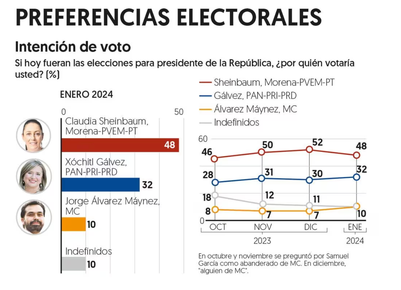 Realizada en enero, los datos revelan que la candidata de Morena tiene 48% de las preferencias, mientras que la abanderada de la coalición Fuerza por México tiene el 32% de las preferencias. En contraste con la encuesta de diciembre, Sheinbaum retrocedió cuatro puntos y Xóchitl Gálvez ganó dos.