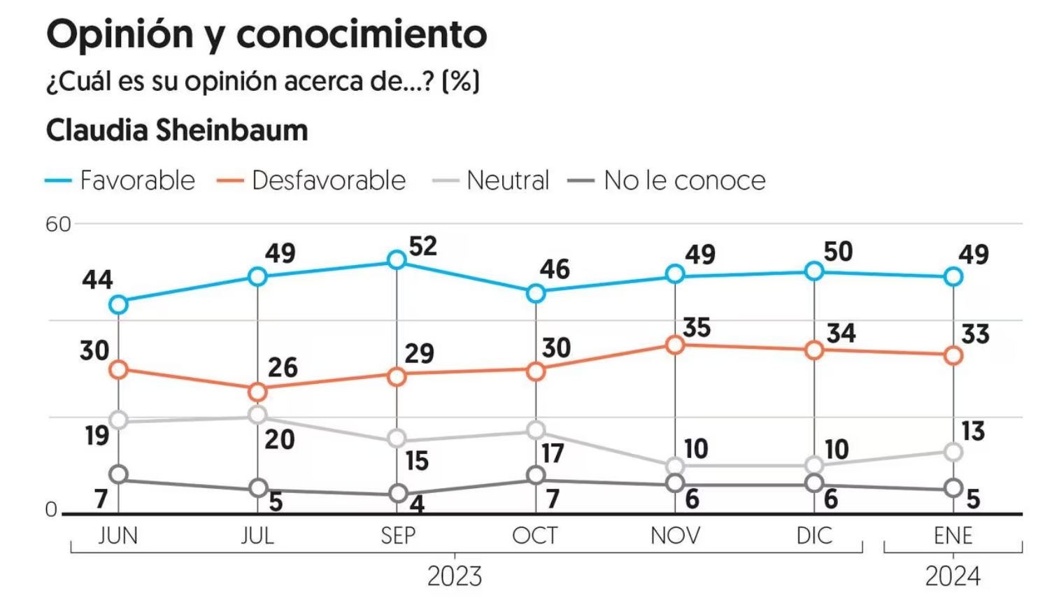 Claudia Sheinbaum registró las mismas cifras que el mes anterior, 49% de opinión favorable y 33% de opinión negativa.