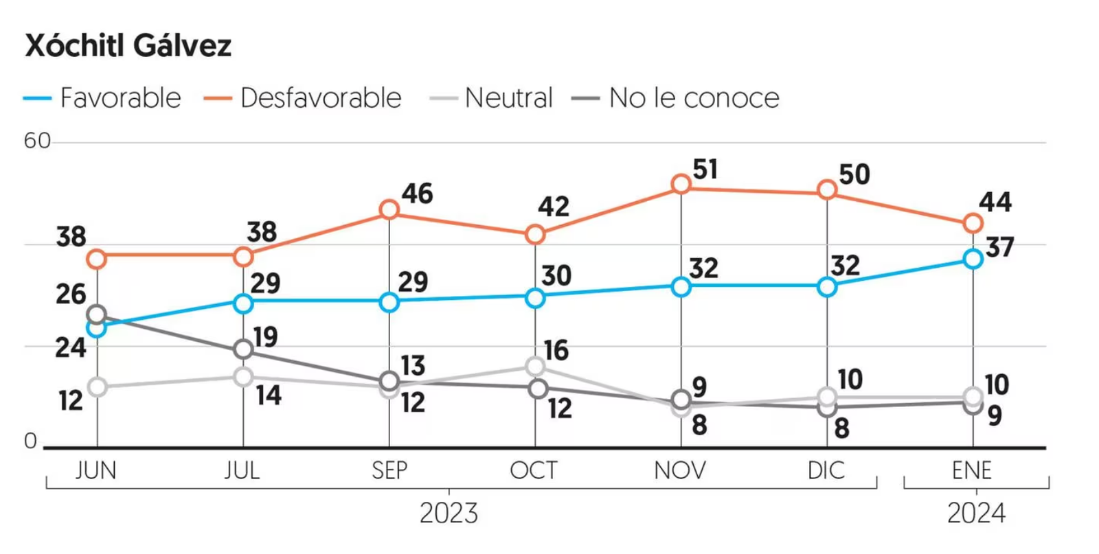 Los números de la encuesta también reflejan que subieron los positivos en imagen de Xóchitl Gálvez, al pasar de los 32 a 37% en el último mes, y bajaron sus negativos de 50 a 44%.