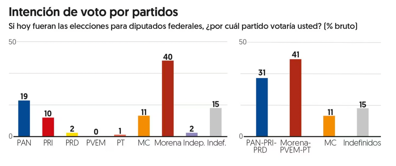 Sobre la votación para la Cámara de Diputados, Morena concentra una intención de voto del 40%, mientras que el PAN registra 19%, el PRI 10, PRD 11%, y hay 15% de indefinidos.