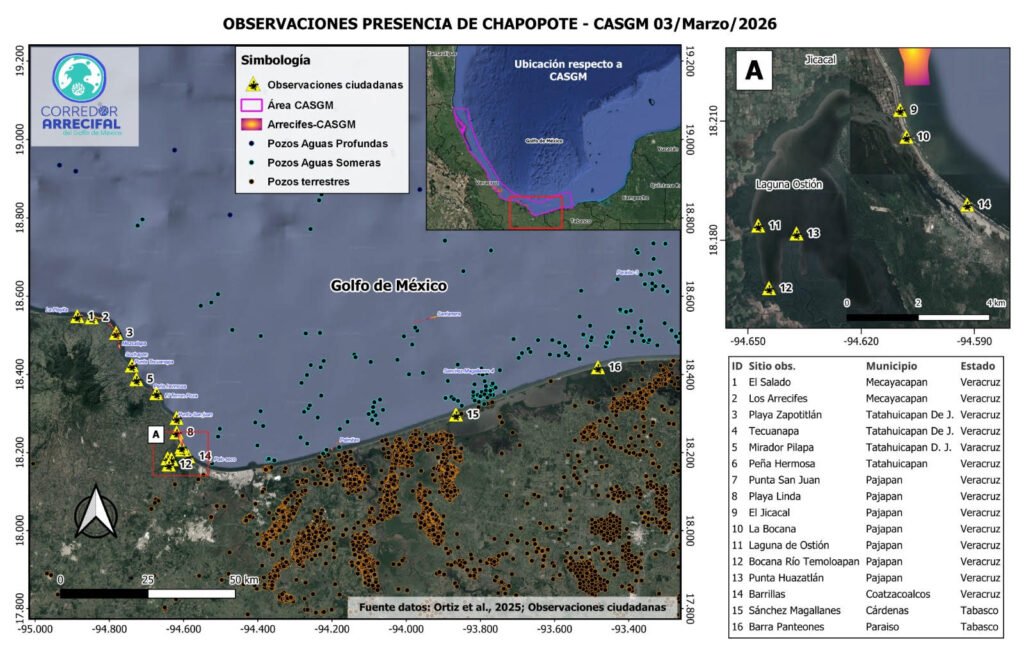 Investigadores agrupados en la Red Corredor Arrecifal de México, identificaron mediante imágenes satelitales una mancha de petróleo de aproximadamente 37 kilómetros mar adentro frente a la Sonda de Campeche, la cual podría estar relacionada con infraestructura petrolera y con la dispersión del crudo hacia las costas de Tabasco y Veracruz.
