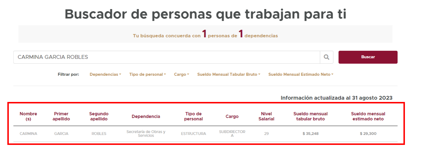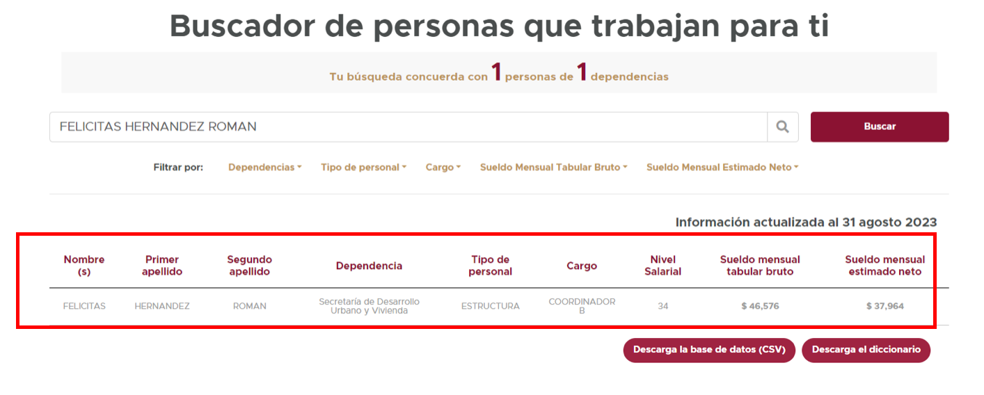 Mientras que Isabel Calderón no es funcionaria pública, Felicitas Hernández es Coordinadora de Sistemas de Actuación por Cooperación de la Secretaría de Desarrollo Urbano y Vivienda con un sueldo bruto de 46 mil 576 pesos.