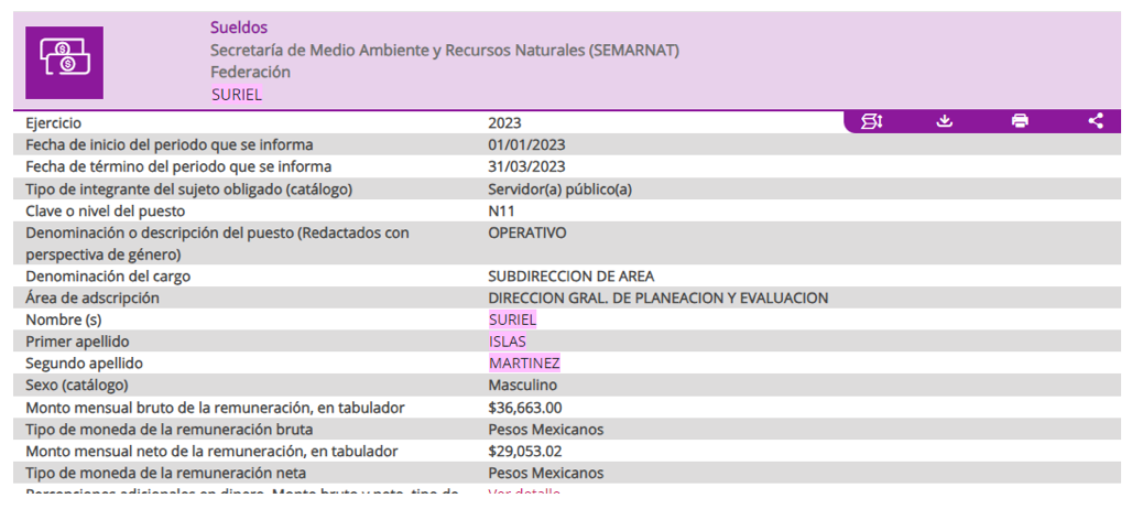 Actualmente, Suriel Islas se desempeña como subdirector en la Subsecretaría de Planeación y Política Ambiental de la Secretaría de Medio Ambiente y Recursos Naturales con un salario de casi 30 mil pesos al mes.