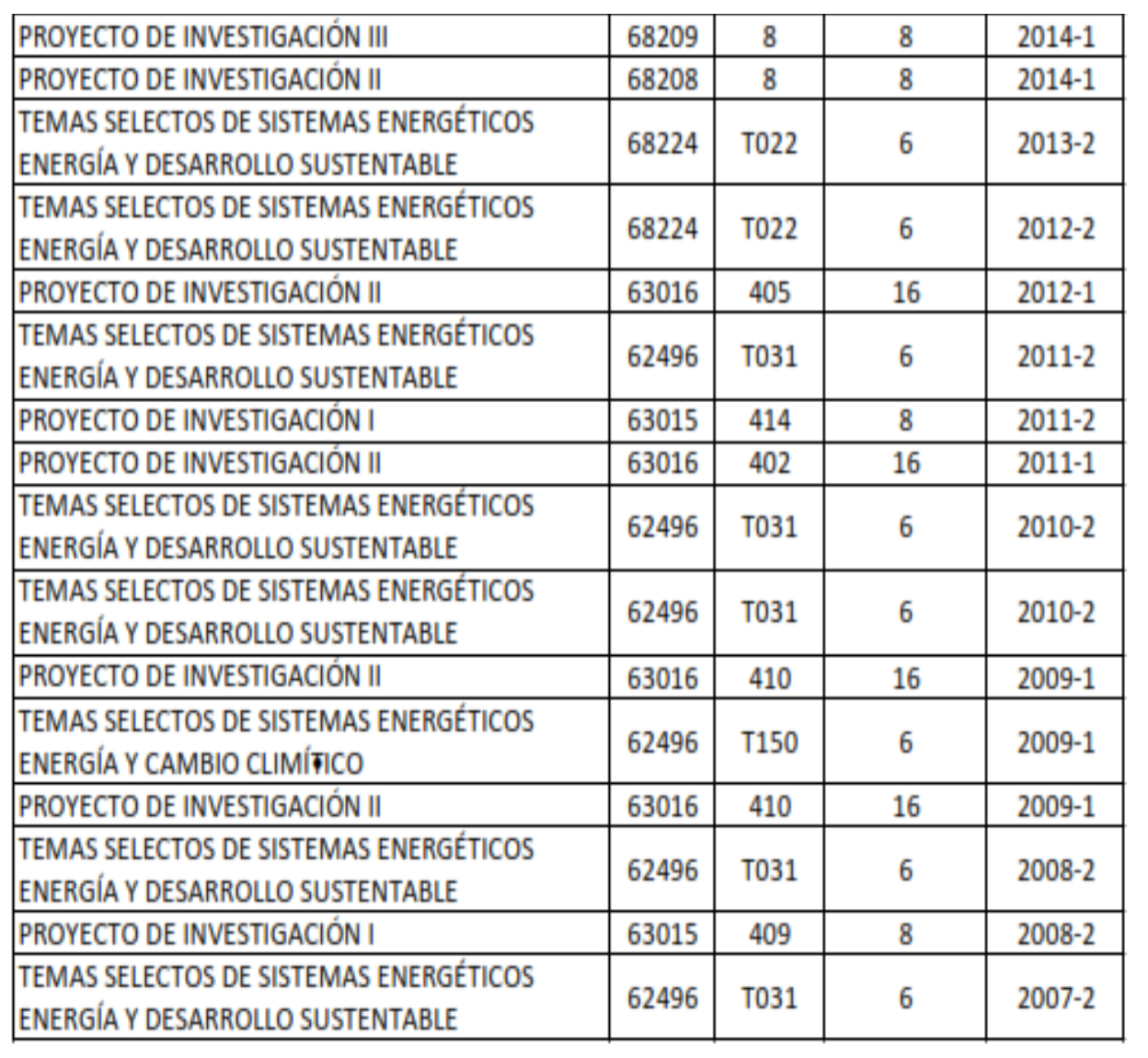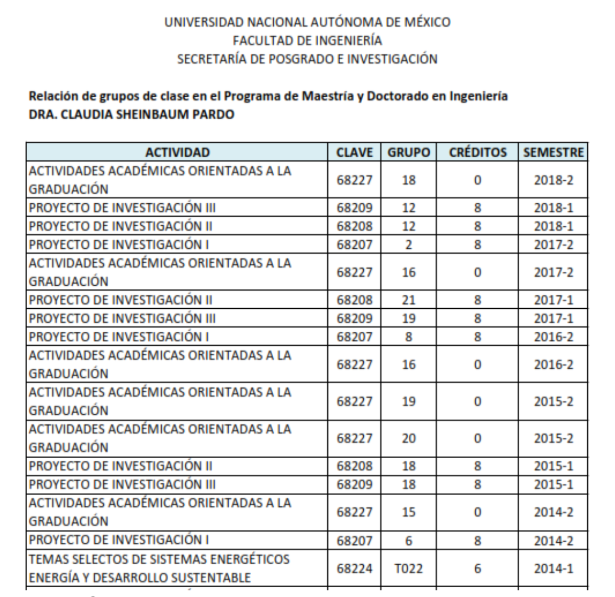 Aquí se ve la lista de cursos que supuestamente dio Sheinbaum en 2007, 2008, 2009, 2010, 2011, 2012, 2014, 2015, 2016, 2017 y 2018. Especial atención merecen los años entre 2015 y 2018, en que fue jefa delegacional, candidata a jefa de gobierno y luego jefa de gobierno electa. En esos años impartió, supuestamente, trece cursos, todos dirigidos a la titulación en posgrado.