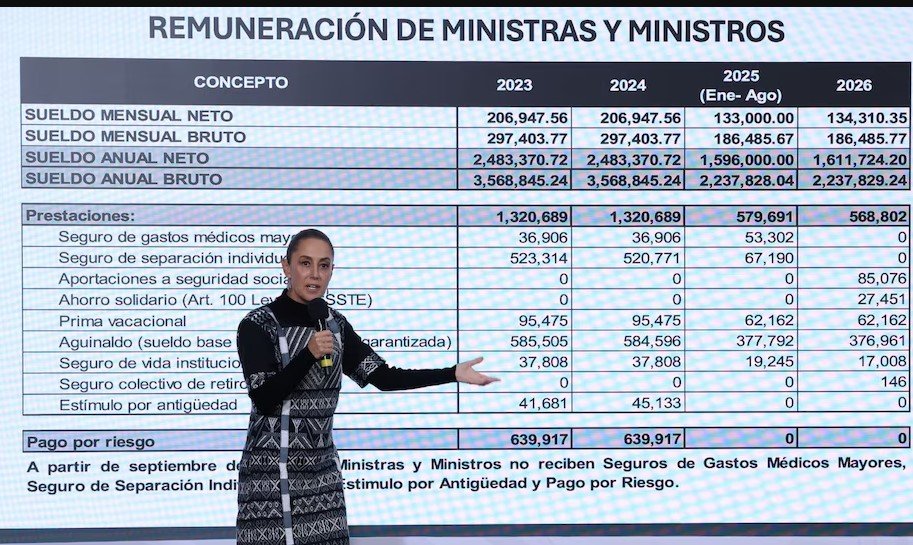 El equipo de la presidenta armó una enorme lista de decenas de rubros de prestaciones y ventajas que tenían los anteriores ministros con la finalidad de apagar el escándalo que rodea a la actual SCJN, encabezada por Hugo Aguilar Ortiz.