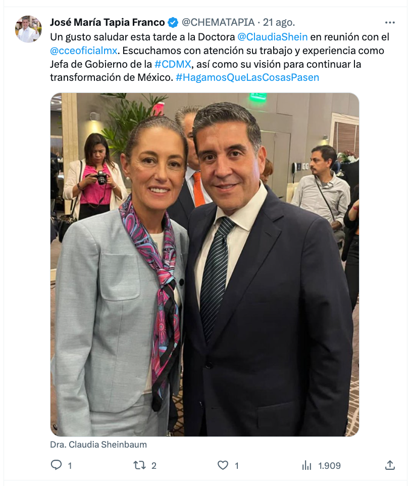 En un posteo en su cuenta, Tapia Franco escribió: “Un gusto saludar esta tarde a la Doctora Claudia Sheinbaum en reunión con CCE. Escuchamos con atención su trabajo y experiencia como jefa de gobierno de la CDMX, así como su visión para continuar la transformación de México”.