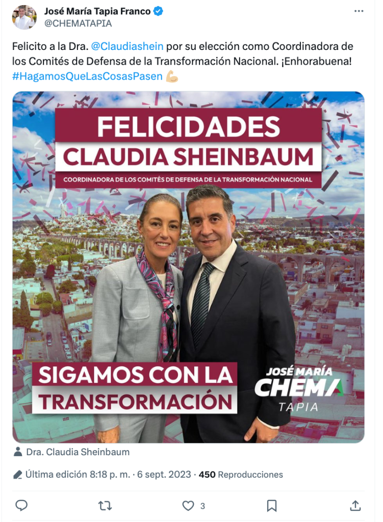 El 6 de septiembre del mismo año publicó una felicitación a Sheinbaum, usando la foto arriba mencionada. “Felicito a la Doctora Claudia Sheinbaum por su elección como Coordinadora de los Comités de Defensa de la Transformación Nacional. ¡Enhorabuena!”. La imagen de ambos tenía de fondo una fotografía de Querétaro y traía el nombre “Chema” Tapia.
