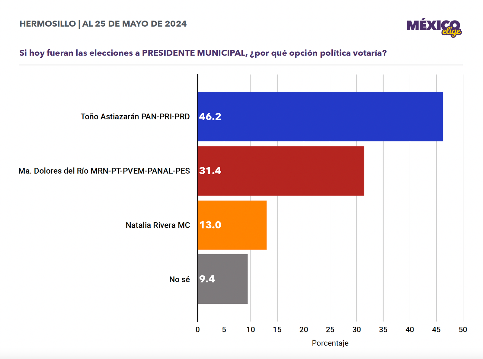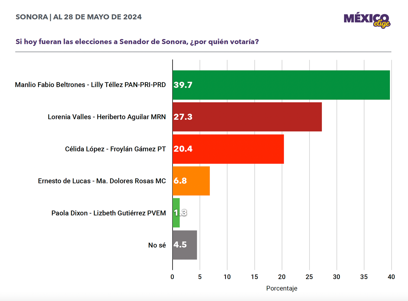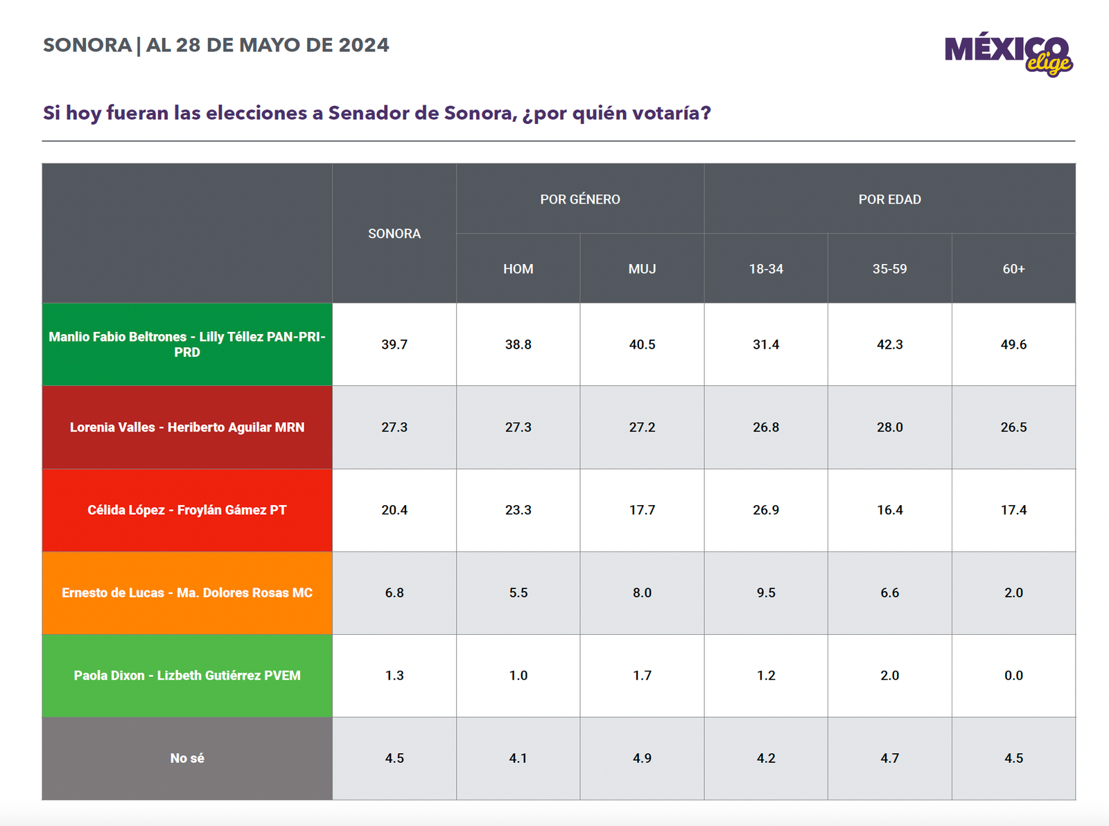 De acuerdo con la última encuesta de México Elige, con corte del 28 de mayo, los sonorenses Téllez y Beltrones, abanderados del PAN-PRI-PRD, acumulan 39.7% de las preferencias electorales. Le siguen los morenistas con 27.3%, luego la dupla de PT que tienen 20.4% de las preferencias y ya muy lejos la de Movimiento Ciudadano con 6.8% y el PVEM con 1.3%.