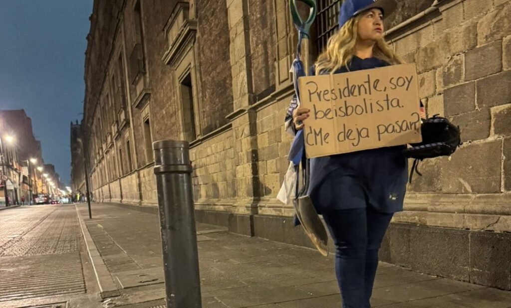 Con la “pala de mando” a un costado, Ceci Flores mostró un cartel con la leyenda “Presidente, soy beisbolista ¿Me deja pasar?”.
