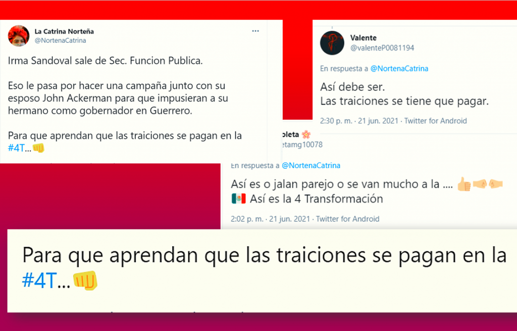 Luego de anunciada su destitución, cuentas afines al gobierno federal hicieron mofa de la ex secretaria de la Función Pública, Irma Eréndira Sandoval, sobre quien señalaron que su caso debe servir “de ejemplo” para que otros funcionarios que pretendan privilegiar sus intereses personales por encima de la Cuarta Transformación aprendan que “las traiciones se pagan”.