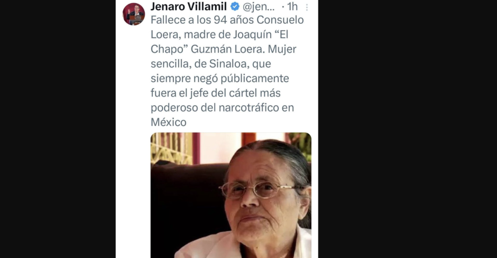“Fallece a los 94 años Consuelo Loera, madre de Joaquín “El Chapo” Guzmán Loera. Mujer sencilla, de Sinaloa, que siempre negó públicamente fuera el jefe del cártel más poderoso del narcotráfico en México”, escribió.